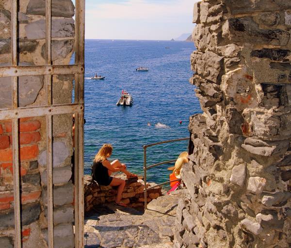 Keywords: window sea girl boats stone door water blonde woman