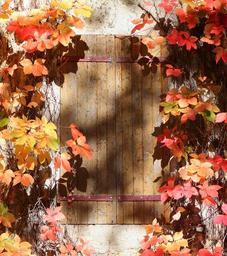Keywords: window shutter autumn leaves home house architecture building facade house window decoration old wooden europe rustic wood country exterior village rural outdoor weathered red brown france fr languedoc charming