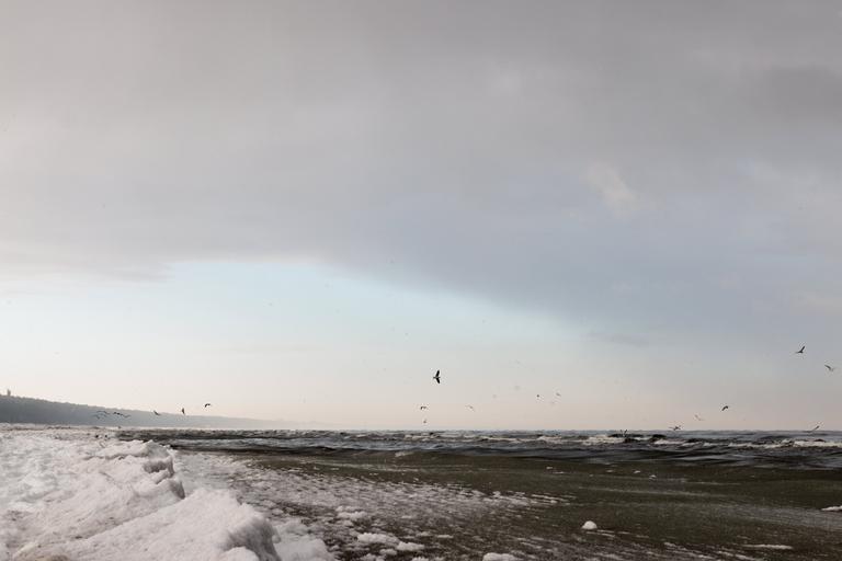 Keywords: latvia jurmala baltic sea balticsea gulf of riga gulfofriga bay seaside beach winter snow ice water gulls seagulls seabirds birds shore coast outdoor sky Jurmala beach in winter Jurmala beach in winter