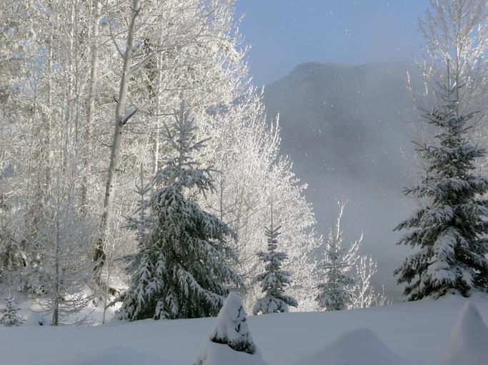 Keywords: winter early morning foggy canim lake british columbia canada landscape nature trees scenery water cold snow ice-cold