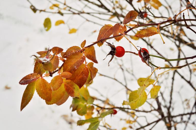 Keywords: winter leaves rosehips rose autumn snow leaf season red branch white