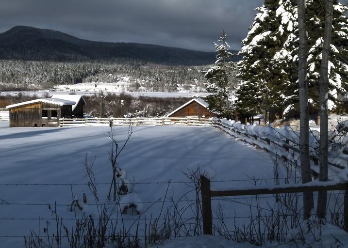 Keywords: winter scenery canim lake british columbia canada snow weather mood sunny day cold landscape trees wintry winter dream snow magic frosty icy outside scenic lake ranch farm house fence