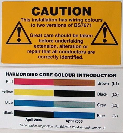 Keywords: Wiring colours.jpg en U K Electrical installation wiring colour color standards 2004-6 own Francis E Williams 2010-12-02 Pictures of actual warning labels used on distribution boards in the U K to warn the contractor who may undertake future work Safety labels |
