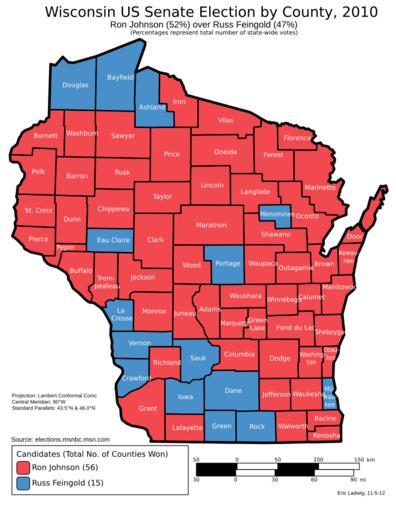 | Keywords: Wisconsin US Senate Election 2010.svg en Depiction of the Wisconsin national Senate election in 2010 where Republican Ron Johnson won over incumbent Democrat Russ Feingold elections msnbc msn com Eric Ladwig; University of Illinois Urbana-Champaign 2012-11-05 2010 United States Senate election maps 2010 in Wisconsin 2010 in politics |
