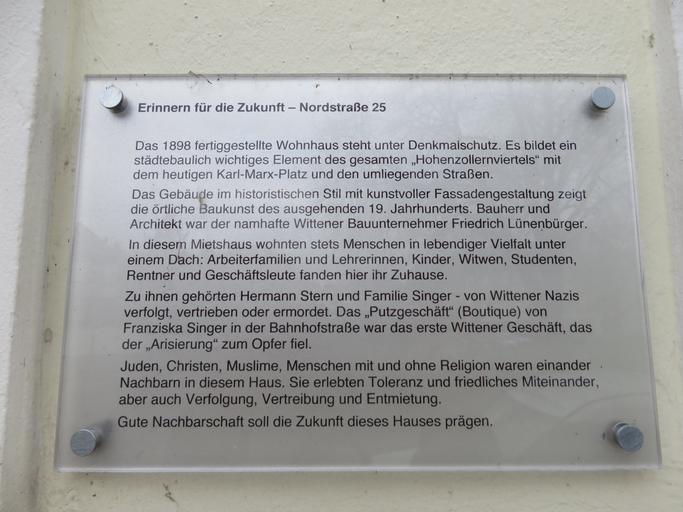 Keywords: Witten Tafel Nordstraße 25.jpg de Gedenktafel an Haus Nordstraße 25 in Witten en Commemorative plaque at house Nordstraße 25 in Witten Germany eo Memortabulo ĉe domo Nordstraße 25 en Witten Germanio 2016-03-23 16 26 37 own Reclus other versions other fields 1 inscription inscription Erinnern für die Zukunft “ Nordstraße 25 Das 1898 fertiggestellte Wohnhaus steht unter Denkmalschutz Es bildet ein<br/> städtebaulich wichtiges Element des gesamten žHohenzollernviertels mit<br/> dem heutigen Karl-Marx-Platz und den umliegenden Straßen Das Gebäude im historischen Stil mit kunstvoller Fassadengestaltung zeigt<br/> die örtliche Baukunst des ausgehenden 19 Jahrhunderts Bauherr und<br/> Architekt war der namhafte Wittener Bauunternehmer Friedrich Lünenbürger In diesem Mietshaus wohnten stets Menschen in lebendiger Vielfalt unter<br/> einem Dach Arbeiterfamilien und Lehrerinnen Kinder Witwen Studenten <br/> Rentner und Geschäftsleute fanden hier ihr Zuhause Zu ihnen gehörten Hermann Stern und Familie Singer “ von Wittener Nazis<br/> verfolgt vertrieben oder ermordet Das žPutzgeschäft Boutique von<br/> Franziska Singer in der Bahnhofstraße war das erste Wittener Geschäft das<br/> der žArisierung zum Opfer fiel Juden Christen Muslime Menschen mit und ohne Religion waren einander<br/> Nachbarn in diesem Haus Sie erlebten Toleranz und friedriches Miteinander <br/> aber auch Verfolgung Vertreibung und Entmietung Gute Nachbarschaft soll die Zukunft dieses Hauses prägen de 51 43998 7 3306933333333 cc-zero FoP-Germany Erinnern für die Zukunft Witten Nordstraße 25 Witten |