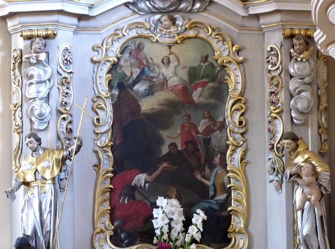 | Keywords: Wittersheim StUlrich 31.JPG Alsace Bas-Rhin Wittersheim Eglise Saint-Ulrich Autel secondaire 14 intercesseurs 1766 avec statues baroques de St-Jacques et St-Antoine Tableau de Louis et Carola Sorg 1860 own 2012 Ralph Hammann Cc-zero Artwork / Œuvre d'art / Kunstwerk oil canvas cm 135 80 Eglise Saint-Ulrich Wittersheim Autel secondaire PM67000471 IM67002016 object history Tableaux non classés réalisés par les peintres strasbourgeois Louis et Carola Sorg en 1860 other versions Ralph Hammann PD-old accession number Photographs of Wittersheim by Ralph Hammann Taken with Canon PowerShot SX20 IS Autels secondaires Église Saint-Ulrich de Wittersheim Baroque reliefs in Alsace Reliefs of putti in Alsace Baroque statues in Bas-Rhin Wooden statues in Bas-Rhin 18th-century statues in Alsace 1766 statues in France Statues of Saint James the Greater in France Statues of Saint Anthony of Padua in Alsace Paintings of Christian saints in France Louis Sorg Caroline Sorg Neoclassical church paintings in Alsace 19th-century church paintings in Alsace Fourteen Holy Helpers 1860 oil on canvas paintings in France 1860 works in Alsace |