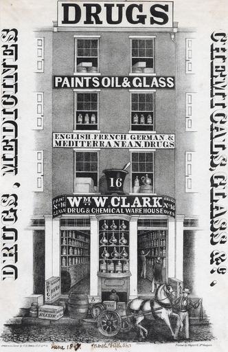 | Keywords: library company of philadelphia librarycompanyofphiladelphia lithography (philadelphia, pa.) lithographyphiladelphiapa philadelphia on stone philadelphiaonstone rease, w. h. reasewh clark, william w clarkwilliamw chemical industry (philadelphia, pa.) chemicalindustryphiladelphiapa pharmacutical industry (philadelphia, pa.) pharmacuticalindustryphiladelphiapa merchandise displays (philadelphia, pa.) merchandisedisplaysphiladelphiapa Advertisement showing the 4-story building covered in signage for the druggist at 16 North Fifth Street. Signs advertise "Drugs, Paint Oil & Glass. English. French. German & Mediterranean Drugs." Through the open entranceways of the business, shelves of bottles on cabinets are visible lining the walls. A clerk reaches for one of the notions as a patron enters the store. Another clerk descends into the cellar in front of the building. Crates and barrels of "elixir," "drugs," and "paint" marked with delivery addresses (e.g., J.H. B. & Co.) line the sidewalk across from a horse-drawn dray parked in the street. Also shows bottles, decanters, jugs, and boxes adorning the central display window and upper floor windows. An oversize model of a mortar and pestle is displayed above the entrances. Clark operated from the address 1839-1853. Advertisement showing the 4-story building covered in signage for the druggist at 16 North Fifth Street. Signs advertise "Drugs, Paint Oil & Glass. English. French. German & Mediterranean Drugs." Through the open entranceways of the business, shelves of bottles on cabinets are visible lining the walls. A clerk reaches for one of the notions as a patron enters the store. Another clerk descends into the cellar in front of the building. Crates and barrels of "elixir," "drugs," and "paint" marked with delivery addresses (e.g., J.H. B. & Co.) line the sidewalk across from a horse-drawn dray parked in the street. Also shows bottles, decanters, jugs, and boxes adorning the central display window and upper floor windows. An oversize model of a mortar and pestle is displayed above the entrances. Clark operated from the address 1839-1853. |
