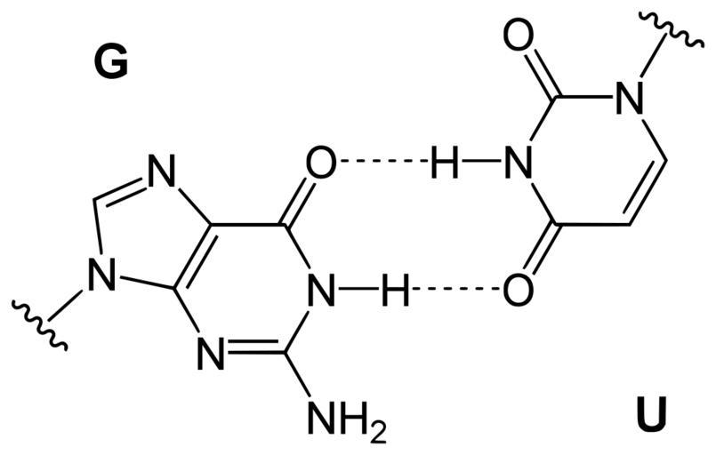 Keywords: Wobble base pair GU reverse.svg en reverse Wobble base pairing guanine uracil GU de reverses Wobble-Basenpaar guanine uracil GU Own Yikrazuul 5 11 08 DNA chemical structures Base pairing