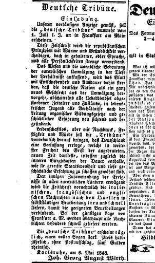 Keywords: Wochenblatt für den Königlich-Bayerischen Gerichtsbezirk Zweibrücken - Nr 65 - 30. Mai 1848 - Anzeige Deutsche Tribüne (Ausschnitt).png en announcement for the german newspaper Deutsche Tribüne to reprint in 1948 1948-05-30 Google Books via Bayerische Staatsbibliothek http //books google de/books id 2L9DAAAAcAAJ pg PA46-IA26 G Ritter Custom license marker 2013 02 20 PD-old-70-1923 Deutsche Tribüne |