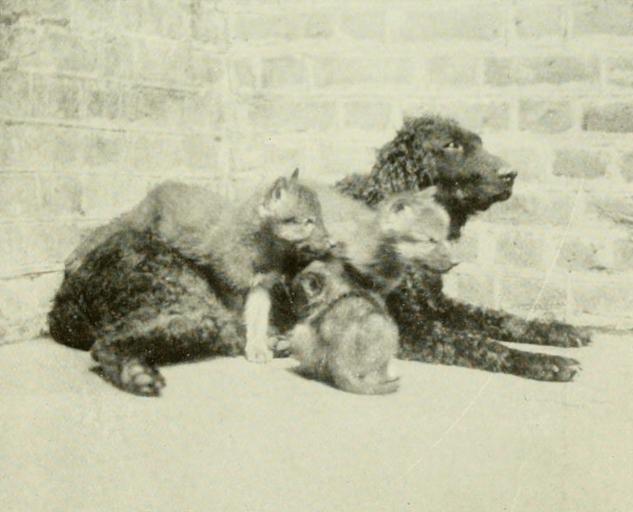 Keywords: Wolves foster mother.png en Wolf pups with their foster mother The book of the animal kingdom Westell William Percival 1874-1937 1910 PD-old Nursing wolves Curly Coated Retriever Black and white photographs of dogs Dogs with other animals Canis lupus juvenile