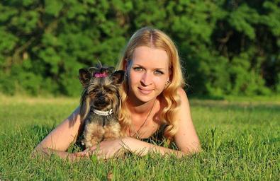 Keywords: woman dog yorkshire terrier love friendship grass summer pet