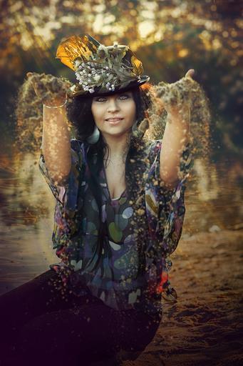 Keywords: woman face characteristics available eyes flowered hat brunette decoration cheerful girl feeling healthy luck hat hair young girl cosmetics art smile joy of life fantasy beauty