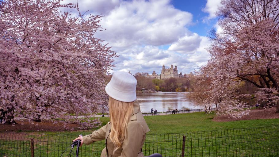 Keywords: woman girl lady hat in the park park bike ride new york city new york city manhattan skyline america building travel central park sky landmark cityscape usa blue downtown architecture trees spring cherry tree