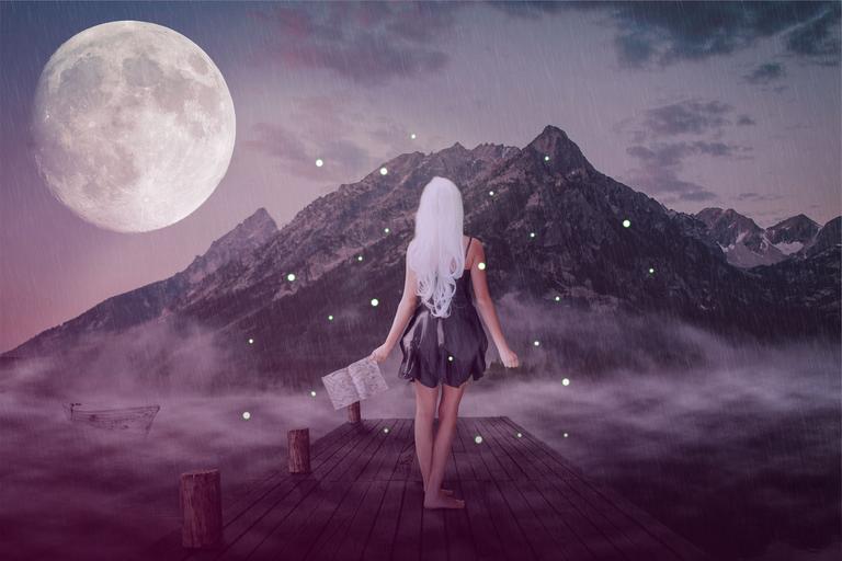 Keywords: woman girl young pretty nature web lake mountains bergsee moon night dark rain mood background young woman person women sexy young girl human young women fig hair skin blond move femininity wet fog