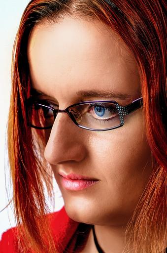 Keywords: woman glasses portrait red hair red straight hair short hair medium hair necklace black necklace young perfect skin flawless skin blue eyes face