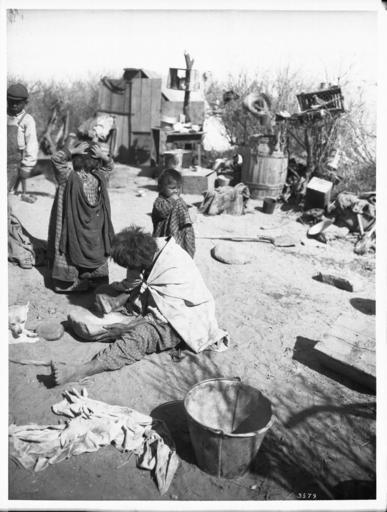 Photograph of an Apache Indian Woman grinding corn(?) on a stone mortar in an Apache Indian camp, Palomas, Apache Indian Reservation, 1903. She sits on the ground with the mortar between her legs. Three children stand nearby. Various household supplies and implements including blankets, clothing a barrel, boxes, cooking gear, etc, are scattered on the ground and in a pile behind her near a tent erected in some tall wild grass. A dog sits in front of the woman. A pail and a cloth sit on the ground in the foreground.