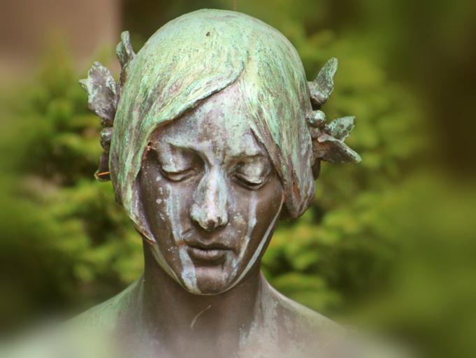 Keywords: woman head portrait sculpture statue antique old copper cemetery weathered mourning face human girl tears