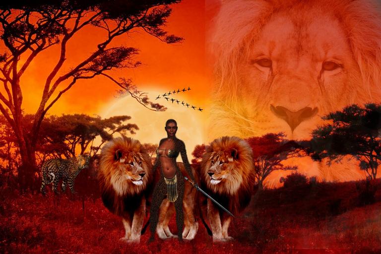 Keywords: woman lion africa savannah red cat warrior mane leopard jungle sword