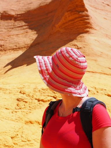 Keywords: woman person hat summer tourism places of interest ocher rocks ocher ocher quarry rock color bright colorful orange red yellow roussillon luberon massif france vaucluse ocher mine provence ochre colours red ocher ockerbraun ocher mining earth color brown ironstone clay mineral department of vaucluse provence-alpes-côte d'azur arrondissement apt canton apt nature park luberon apt gordes chaussee of geants falaises de sang mixture hue