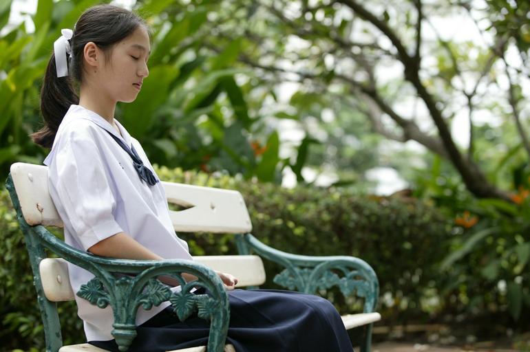 Keywords: woman sitting thailand asian girl bench park asia relax calm peaceful relaxed