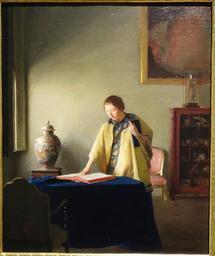 Keywords: Woman with Book by William McGregor Paxton, c. 1910, oil on canvas on board - New Britain Museum of American Art - DSC09470.JPG en Exhibit in the New Britain Museum of American Art New Britain Connecticut USA This artwork is in the public domain because the artist died more than 70 years ago The museum permitted photographs of this exhibit without restriction 2013-06-27 12 44 23 own Daderot PD-old-70-1923 cc-zero Paintings in the New Britain Museum of American Art Uploaded with UploadWizard William McGregor Paxton Paintings of standing women reading indoors Exotic decorative artefacts in paintings |