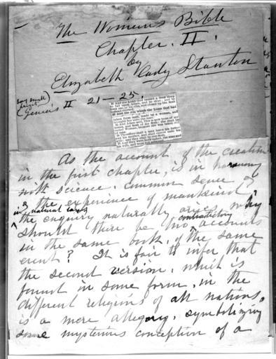 | Keywords: Woman's Bible Genesis.jpg en Handwritten draft of chapter II of The Woman's Bible 1895 covering Genesis 21-25 http //lcweb2 loc gov/mss/mcc/049/0001 jpg Single image at Library of Congress http //lcweb2 loc gov/cgi-bin/ampage collId mcc fileName 049/page db recNum 0 itemLink r ammem/mcc field DOCID+ lit mcc/049 Draft of Elizabeth Cady Stanton's The Woman's Bible ca 1895 151 pages scanned Library of Congress Elizabeth Cady Stanton between 1888 1895 public domain unknown Feminism | ||||