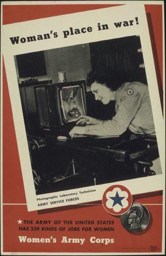| Keywords: "Woman's place in war^ Photographic laboratory Technician. Women's Army Corps" - NARA - 513702.tif  Scope and content General notes 513702 Local identifier 44-PA-259B Office for Emergency Management Office of War Information Domestic Operations Branch Bureau of Special Services 03/09/1943 - 09/15/1945 Still Picture Records Section Special Media Archives Services Division NWCS-S National Archives at College Park 8601 Adelphi Road College Park MD 20740-6001 1941 - 1945 Record group Record Group 44 Records of the Office of Government Reports 1932 - 1947 Record group ARC 373 World War II Posters compiled 1942 - 1945 Series ARC 513498 File unit File unit ARC Variant control numbers NAIL Control Number NWDNS-44-PA-259B yes Other versions <gallery> File Woman's_place_in_war _Photographic_laboratory_Technician _Women's_Army_Corps _-_NARA_-_513702 tif tif File Woman's_place_in_war _Photographic_laboratory_Technician _Women's_Army_Corps _-_NARA_-_513702 jpg jpg </gallery> NARA-cooperation PD-USGov World War II posters from the United States NARA TIF images with categorized JPGs |