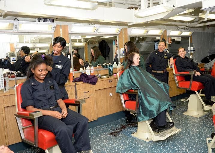 | Keywords: Women at Sea open salon for Sailors and Marines aboard MKI 141025-N-UK333-012.jpg en Female Sailors receive hair treatments during a Women At Sea at-sea salon day in the barber shop onboard the amphibious assault ship USS Makin Island LHD 8 Makin Island is part of the Makin Island Amphibious Ready Group ARG and with the 11th Marine Expeditionary Unit MEU maintains its readiness to promote long-term regional security by conducting regularly scheduled recurring exercises in the U S 5th fleet area of responsibility U S Navy photo by Mass Communication Specialist 1st Class Ronald Gutridge/Released 2014-10-25 Petty Officer 2nd Class Ronald Gutridge https //www dvidshub net/image/1643834 141025-N-UK333-012 2014-11-05 03 46 RED SEA AT SEA PD-USGov-Military-Navy USS Makin Island LHD-8 11th Marine Expeditionary Unit Images from DoD uploaded by Fæ |
