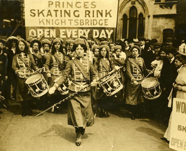 | Keywords: suffrage the women's library thewomenslibrary women history politics hires monochrome indoor 7JCC/O/02/021Photograph, printed, paper, monochrome, drum and fife band marching with a banner 'PRINCES SKATING RINK KNIGHTSBRIDGE: OPEN EVERY DAY', led by Mary Leigh; on reverse: typed caption, manuscript inscription 'Copy for Mrs May', and printed 'Copyright: World's Graphic Press Limited, 36-38 Whitefriars Street, Fleet Street, London EC. Please Acknowledge'  7JCC/O/02/021Photograph, printed, paper, monochrome, drum and fife band marching with a banner 'PRINCES SKATING RINK KNIGHTSBRIDGE: OPEN EVERY DAY', led by Mary Leigh; on reverse: typed caption, manuscript inscription 'Copy for Mrs May', and printed 'Copyright: World's Graphic Press Limited, 36-38 Whitefriars Street, Fleet Street, London EC. Please Acknowledge' |