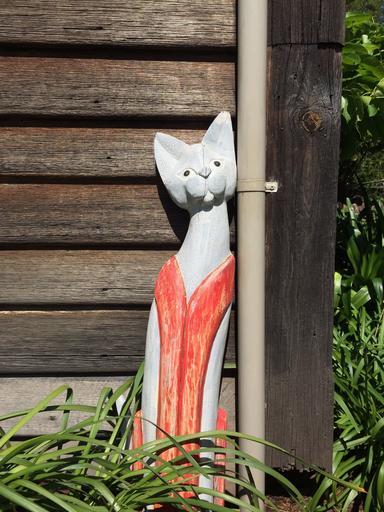 Keywords: wood cat wooden cat art brown building sculpture faded feline face exterior garden