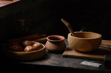 Keywords: wood pots shadow table kitchen antique vintage history wooden rustic home potatoes potato bowls pottery spoon mix stir cook bake