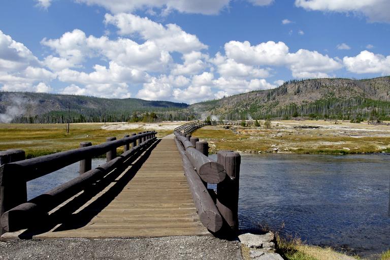 Keywords: wooden bridge yellowstone river wyoming usa landscape nature scenery