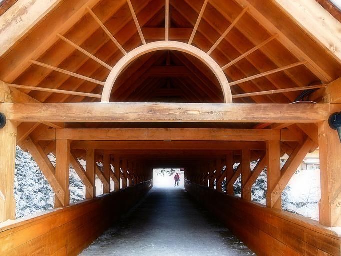 Keywords: wooden covered bridge travel structure architecture buildings village sun peaks resort british columbia canada skiing ski hill outdoor winter