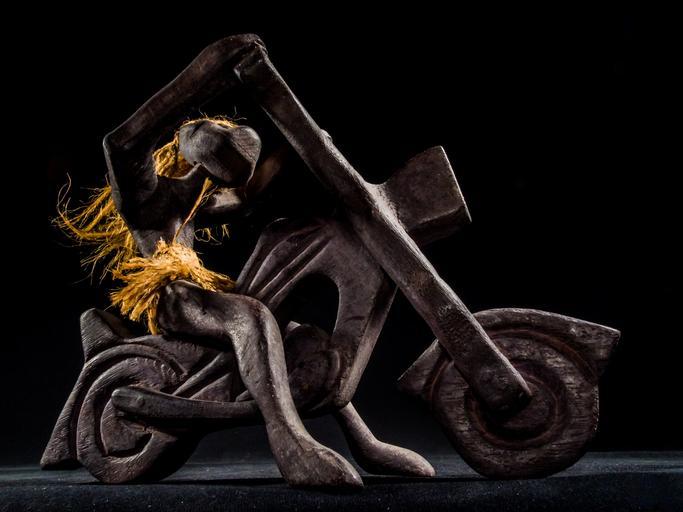 Keywords: wooden motorbike with driver wild hairstyle wood model art from thailand