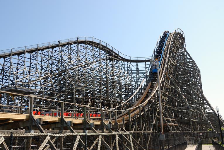 Keywords: wooden roller coaster ride vintage amusement coaster park fun wooden roller coaster wood entertainment thrill old structure play boardwalk summer joy funfair speed vacation track exciting fast construction recreation sky challenge