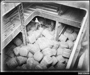 | Keywords: hood collection hoodcollection samuel j hood collection samueljhoodcollection magdalene vinnen magdalenevinnen woolloomooloo sydney german german barque germanbarque barque crew wool wool bales woolbales cargo hold sam hood samhood blackandwhite monochrome surreal photo border texture black and white This photograph depicts crew members with wool bales on board the four-masted steel barque MAGDALENE VINNEN. The vessel sailed into Sydney Harbour on 27 February 1933, under the command of Captain Lorenz Peters. The barque was loaded with almost 16,000 bales of wool, the fourth largest shipment to have left Sydney, before it sailed the record-breaking 82-day voyage for Falmouth, England. MAGDALENE VINNEN visited Australia again in 1935, with a cargo of wheat, lifted from Port Broughton in South Australia.  This photo is part of the Australian National Maritime Museum’s Samuel J. Hood Studio collection. Sam Hood (1872-1953) was a Sydney photographer with a passion for ships. His 60-year career spanned the romantic age of sail and two world wars. The photos in the collection were taken mainly in Sydney and Newcastle during the first half of the 20th century.   The ANMM undertakes research and accepts public comments that enhance the information we hold about images in our collection. This record has been updated accordingly.   Photographer: Samuel J. Hood Studio Collection  Object no. 00035608 This photograph depicts crew members with wool bales on board the four-masted steel barque MAGDALENE VINNEN. The vessel sailed into Sydney Harbour on 27 February 1933, under the command of Captain Lorenz Peters. The barque was loaded with almost 16,000 bales of wool, the fourth largest shipment to have left Sydney, before it sailed the record-breaking 82-day voyage for Falmouth, England. MAGDALENE VINNEN visited Australia again in 1935, with a cargo of wheat, lifted from Port Broughton in South Australia.  This photo is part of the Australian National Maritime Museum’s Samuel J. Hood Studio collection. Sam Hood (1872-1953) was a Sydney photographer with a passion for ships. His 60-year career spanned the romantic age of sail and two world wars. The photos in the collection were taken mainly in Sydney and Newcastle during the first half of the 20th century.   The ANMM undertakes research and accepts public comments that enhance the information we hold about images in our collection. This record has been updated accordingly.   Photographer: Samuel J. Hood Studio Collection  Object no. 00035608 |