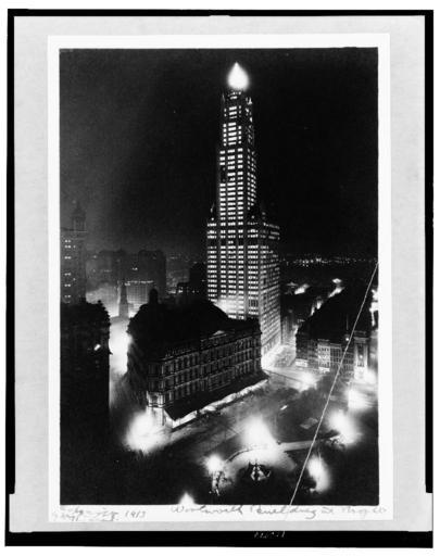 | Keywords: Woolworth Building at night, New York City.jpg Uploaded with en wp UW marker 2013 05 24 Title Woolworth Building at night New York City Date Created/Published c1913 Medium 1 photographic print Reproduction Number LC-USZ62-106874 b w film copy neg Rights Advisory No known restrictions on publication Call Number U S GEOG FILE - New York--New York City--Buildings--Woolworth item P P Repository Library of Congress Prints and Photographs Division Washington D C 20540 USA Notes J181147 U S Copyright Office Title devised by Library staff Copyright by William Townand Published in The tradition of technology Landmarks of Western technology / Leonard C Bruno Washington D C Library of Congress 1995 p 303 http //www loc gov/pictures/item/92520567/ 1913 Library of Congress http //www loc gov/pictures/item/92520567/ ;Other information Published in The tradition of technology Landmarks of Western technology / Leonard C Bruno Washington D C Library of Congress 1995 p 303 Library of Congress Check categories 2013 November 1 Fordham_University |