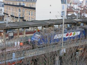 Keywords: Works in Colombes train station.jpg en Refection works in the railway train station in Colombes Hauts-de-Seine France Happily workers work on a track différent of this used by the trains fr Travaux de réfection de la gare de Colombes Hauts-de-Seine Heureusement les ouvriers travaillent sur une voie autre que celle où passent les trains sf 2015-03-22 Tangopaso 48 915227 2 258445 heading W Gare de Colombes Construction in Hauts-de-Seine Colombes SNCF Class BB 27300 |