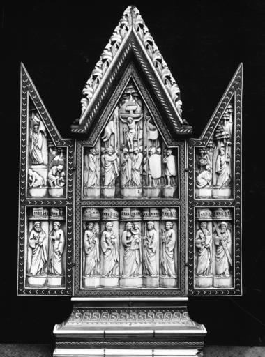 Keywords: Workshop of Embriachi - Triptych with the Crucifixion and Other Scenes - Walters 7198 - Front Open.jpg The central scene of the Crucifixion is composed of five bone plaques flanked by the Resurrection on the left and Christ's Appearance to the Magdalen on the right Below the central figure of the Virgin holding the Christ Child is flanked by Saint Ursula and Saint Apollonia on the right and Saint Lucy and Saint Agatha on the left In the wings are the Apostles Bartholomew and Philip on the right and Evangelists Matthew and John on the left The framework is complete and original with fine intarsia of bone and horn on the base and borders Two panels of openwork bone carved with leaves ornament the cornice The wings are painted on the reverse side with figures of angels in grisaille against a red ground Four original iron fixtures for hanging are preserved The canopy above Saint Agatha is a restoration and the bone border of the base at the right side and corner is missing early Other date century 15 Italian Renaissance bone wood intarsia and polychromy iron fixtures cm 60 39 accession number 71 98 7354 F Ongania Venice date and mode of acquisition unknown Henry Walters Baltimore date of acquisition unknown by purchase Walters Art Museum Henry Walters Acquired by Henry Walters Images in Ivory Precious Objects of the Gothic Age The Detroit Institute of Arts Detroit; The Walters Art Gallery Baltimore 1997 place of origin Venice Italy Walters Art Museum license Medieval art in the Walters Art Museum Embriachi workshop Media contributed by the Walters Art Museum needs category review |