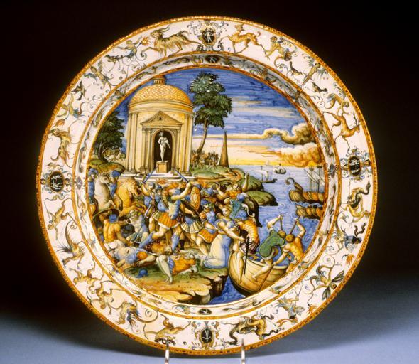 Keywords: Workshop of the Fontana family - Dish with the Abduction of Helen - Walters 481375.jpg This complex scene shows the episode that triggered the Trojan War and ended with the destruction of Troy The goddess Venus promised the Trojan prince Paris that he could marry Helen the most beautiful of mortal women Unfortunately she was already married to the king of Sparta Helen was worshiping at a temple devoted to Venus in the background on the island of Cytherea when she was abducted by Paris and taken to his waiting ships The fine ornaments with fantastic creatures and cameos along the rim show the painter's attempt to imitate the pictorial style of classical antiquity ca 1565 1575 Renaissance earthenware with tin glaze maiolica cm 5 5 43 5 accession number 48 1375 15181 Spitzer Collection date and mode of acquisition unknown no 1143 H Wencke Collection Hamburg date and mode of acquisition unknown no 92 Henry Walters city Baltimore Walters Art Museum Henry Walters Acquired by Henry Walters 1908 text A Renaissance Puzzle Heemskerck's Abduction of Helen The Walters Art Gallery Baltimore 1993 place of origin Urbino Italy Walters Art Museum license Italian Renaissance maiolica in the Walters Art Museum Media contributed by the Walters Art Museum needs category review Fontana workshop Spitzer Collection Abduction of Helen |