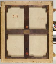 Keywords: Workshop of Gerard Terborch II - A Glass Of Lemonade - Walters 37341 - Back.jpg By the mid-1600s the intimate lives of the middle class joined the raucous lives of the poor as subjects for painting Here an attentive young man tenderly mixes a restorative glass of lemonade for the young woman presumably to convey his own feelings to the love-sick young woman under the watchful eyes of a chaperon Ter Borch was a talented portraitist as well as painter of interiors with figures in satins and other rich fabrics although the effect is diminished here by an over cleaning of the surface decades ago The models for the young people were the artist's half sister and brother Gersina and Moses who were also painters A first version of this composition was painted around 1663 With the assistance of his workshop Ter Borch then made additional versions with small variations between 1666 1668 Baroque Oil on canvas cm 73 7 61 6 accession number 37 341 26676 Charles T Yerkes date and mode of acquisition unknown Charles T Yerkes Sale American Art Association New York 1910 no 134 Henry Walters city Baltimore Walters Art Museum Henry Walters Acquired by Henry Walters 1910 place of origin Netherlands <gallery> File Workshop of Gerard Terborch II - A Glass Of Lemonade - Walters 37341 jpg File Workshop of Gerard Terborch II - A Glass Of Lemonade - Walters 37341 2 jpg </gallery> Walters Art Museum license 3D Paintings in the Walters Art Museum Baroque paintings in the Walters Art Museum Media contributed by the Walters Art Museum needs category review The Glass of Lemonade by Gerard ter Borch II