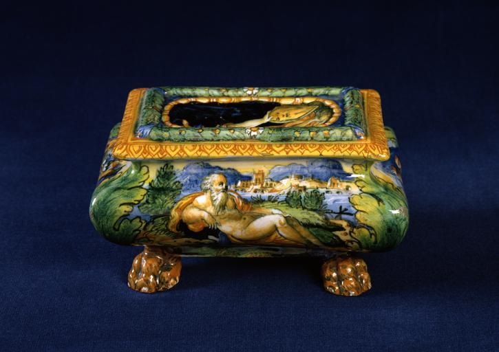 Keywords: Workshop of Guido Durantino - Salt Cellar with a River God - Walters 481338 - Profile.jpg A salt cellar such as this was typically part of a larger set of decorated table ware including plates and bowls as well as matching basins and candlesticks The river god alludes to the element of water and perhaps therefore to the sea as the source of salt In the depression for the salt is an image of Athena the Greek goddess of wisdom On one of the short sides is a coat of arms with three turtles and the Greek word meaning slowness The coat of arms and therefore the owner remains unidentified; however there were many contemporary sayings similar to haste makes waste thus linking wisdom with carefulness ca 1540 1550 Renaissance earthenware with tin glaze maiolica cm 7 7 14 5 accession number 48 1338 8799 William Beckford London 1844 mode of acquisition unknown Hamilton Palace date and mode of acquisition unknown no 817 J E Taylor date of acquisition unknown by purchase no 246 Henry Walters Baltimore date and mode of acquisition unknown Walters Art Museum Henry Walters Acquired by Henry Walters William Beckford 1760-1844 An Eye for the Magnificent The Bard Graduate Center for Studies in the Decorative Arts Design and Culture New York; Dulwich Picture Gallery London 2001-2002 place of origin Urbino Italy Walters Art Museum license Italian Renaissance maiolica in the Walters Art Museum Guido Durantino Media contributed by the Walters Art Museum needs category review Salt cellars |