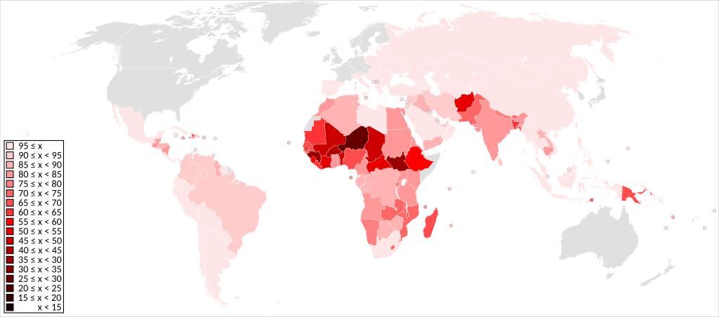 | Keywords: World map of countries by male literacy rate.svg Editor's note This map is saved in human-editable plain text format to make updating easier for everyone Save and open with Notepad and simply cut and paste the country code from one class to another when updating then save and upload noting your changes Recent Robinson projection SVG map shaded by country using an equally distributed red palette according to their male literacy rate x male literacy rate and countries without data are light grey File BlankMap-World6 compact svg map and List of countries by literacy rate data 2015-11-02 First uploaded Jolly Janner <gallery> File World map of countries by literacy rate svg Average File World map of countries by male literacy rate svg Male File World map of countries by female literacy rate svg Female File World map of countries by difference in gender literacy rate svg Gender difference </gallery> Maps with Robinson projection Literacy rate maps of the world |