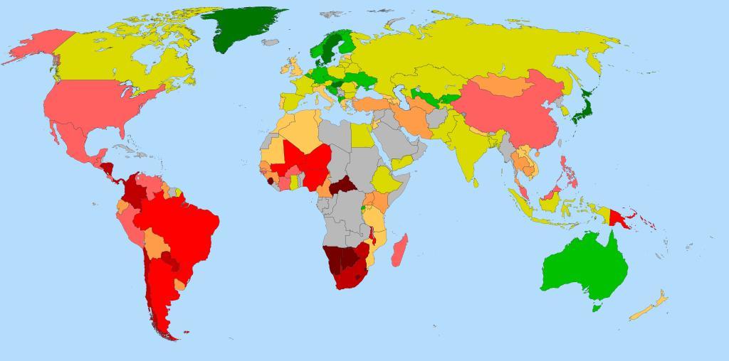 Keywords: World Map Gini coefficient.svg World map showing the Gini coefficient in Dec 2008 a measure of income inequality Representation of Gini coefficient in the world colored by countries see also the legend legend 008000 < 0 25 00C600 0 25 - 0 29 DEDE00 0 30 - 0 34 FFCE63 0 35 - 0 39 FFA552 0 40 - 0 44 FF6B6B 0 45 - 0 49 FF0000 0 50 - 0 54 C60000 0 55 - 0 59 800000 > 0 60 C0C0C0 N A Own 2008-12-30 Cronholm144 see also upload history <gallery>File World Map Gini coefficient Legend png legend</gallery> Gini coefficient maps of the world |