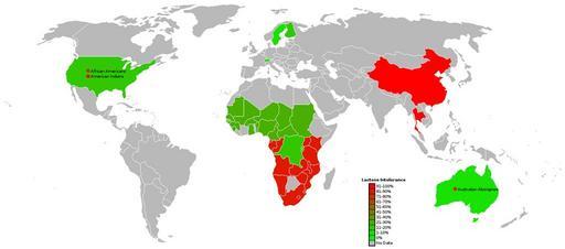 Keywords: World map of lactose intolerance.png Lactose Intolerance by region of the world African countries are only a rough guess http //en wikipedia org/wiki/Image LacIntol-World png 2006-09-02 http //en wikipedia org/wiki/User Nbound Gastroenterology Lactose intolerance Allele genotype or phenotype frequency maps human