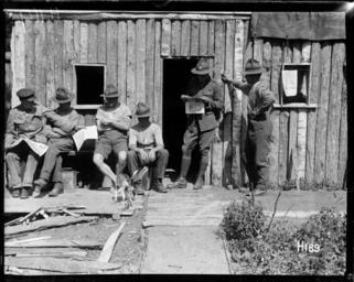 | Keywords: blackandwhite monochrome photo border outdoor black and white Close up view of soldiers engaged in forestry work outside a timber shanty used for accomodation. A small dog is also present. Photograph taken 17 July 1917 by Henry Armytage Sanders. Inscriptions: Inscribed - Photographer's title on negative -bottom right: H169. Quantity: 1 b&w original negative(s). Physical Description: Dry plate glass negative 4 x 5 inches World War I New Zealand soldiers engaged in forestry work outside their shantys. Royal New Zealand Returned and Services' Association :New Zealand official negatives, World War 1914-1918. Ref: 1/2-012869-G. Alexander Turnbull Library, Wellington, New Zealand. natlib.govt.nz/records/22843200 Close up view of soldiers engaged in forestry work outside a timber shanty used for accomodation. A small dog is also present. Photograph taken 17 July 1917 by Henry Armytage Sanders. Inscriptions: Inscribed - Photographer's title on negative -bottom right: H169. Quantity: 1 b&w original negative(s). Physical Description: Dry plate glass negative 4 x 5 inches World War I New Zealand soldiers engaged in forestry work outside their shantys. Royal New Zealand Returned and Services' Association :New Zealand official negatives, World War 1914-1918. Ref: 1/2-012869-G. Alexander Turnbull Library, Wellington, New Zealand. natlib.govt.nz/records/22843200 |