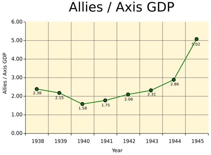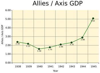| Keywords: WorldWarII-GDP-Relations-Allies-Axis-simple.svg en GDP comparison of Allies and Axis with no notes to keep smaller WorldWarII-GDP-Relations-Allies-Axis-simple png This table shows the relationship in GDP Gross Domestic Product between the Allies and the Axis from 1938 to 1945 counted in international dollars and 1990 prices The vertical axis shows the relationship i e 2 00 means the Allied production was 2 times larger than the Axis Please note that only the following countries are included Austria France Germany Italy Japan UK USA and the Soviet Union Source Mark Harrison The Economics of World War II Six Great Powers in International Comparison Cambridge University Press 1998 Distribution notes estimates 1939 only 67 of Soviet Union is distributed to the Allies due to the pact with Germany 1940 Soviet Union is not included at all 56 of France is distributed to the Axis due to the invasion 1941 44 of Soviet Union is distributed to the Allies after Operation Barbarossa 1944 42 of France and all of Italy is distributed to the Allies due to invasions 1945 All of France and Italy is distributed to the Allies 2008-07-20 22 21 UTC derivative work Hohum talk WorldWarII-GDP-Relations-Allies-Axis-simple png User Dna-webmaster translatable Changed to SVG Hohum WorldWarII-GDP-Relations-Allies-Axis-simple png http //commons wikimedia org/wiki/Image WorldWarII-GDP-Relations-Allies-Axis png http //en wikipedia org/wi</nowiki> Uploaded with derivativeFX Economy during World War II Gross domestic product |