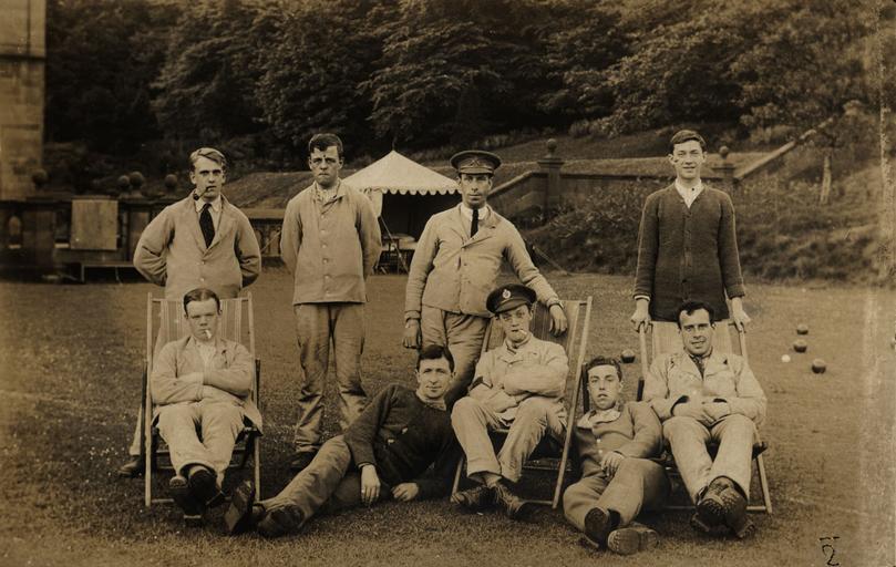 | Keywords: soldiers first world war firstworldwar bowls deckchairs monochrome outdoor This is a photograph of patients at Longshaw Lodge Convalescent Home for Wounded Soldiers, Grindleford, near Sheffield. Reference: DF.BGS-4-9-5 The photograph is part of a larger collection that offers a rare and intimate glimpse in to the Life of a Wounded Soldier recovering from the horrors of World War One. This particular set of photographs is taken from a collection held at Tyne & Wear Archives capturing the every day lives of the nurses and patients at the 3rd Northern General Hospital, Sheffield and Longshaw Lodge Convalescent Home for Wounded Soldiers, Grindleford, near Sheffield. The photographs were taken between August 1916 and June 1917. A blog about this fascinating collection can been viewed here on the Tyne & Wear Archives & Museums website. (Copyright) We're happy for you to share these digital images within the spirit of The Commons. Please cite 'Tyne & Wear Archives & Museums' when reusing. Certain restrictions on high quality reproductions and commercial use of the original physical version apply though; if you're unsure please email archives@twmuseums.org.uk This is a photograph of patients at Longshaw Lodge Convalescent Home for Wounded Soldiers, Grindleford, near Sheffield. Reference: DF.BGS-4-9-5 The photograph is part of a larger collection that offers a rare and intimate glimpse in to the Life of a Wounded Soldier recovering from the horrors of World War One. This particular set of photographs is taken from a collection held at Tyne & Wear Archives capturing the every day lives of the nurses and patients at the 3rd Northern General Hospital, Sheffield and Longshaw Lodge Convalescent Home for Wounded Soldiers, Grindleford, near Sheffield. The photographs were taken between August 1916 and June 1917. A blog about this fascinating collection can been viewed here on the Tyne & Wear Archives & Museums website. (Copyright) We're happy for you to share these digital images within the spirit of The Commons. Please cite 'Tyne & Wear Archives & Museums' when reusing. Certain restrictions on high quality reproductions and commercial use of the original physical version apply though; if you're unsure please email archives@twmuseums.org.uk |