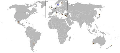 | Keywords: WRC-2004.png Map of World Rally Championship rallies held in 2004 Color coding is black for tarmac events brown for gravel blue for snow/ice and red for mixed surface events 2007-03-27 Josh Baumgartner Josh 16 37 27 March 2007 UTC Public domain World Rally Championship maps 2004 in World Rally Championship |