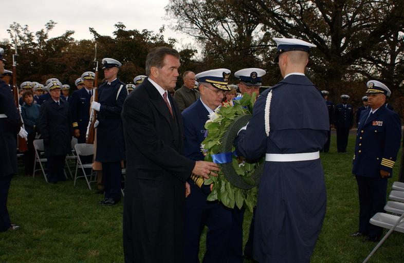 Keywords: WREATH LAYING CEREMONY DVIDS1075049.jpg en ARLINGTON Va Nov 11 2003 --Department of Homeland Security Secretary Tom Ridge Coast Guard Commandant Adm Thomas H Collins and Master Chief Petty Officer of the Coast Guard Frank Welch place a wreath at Coast Guard Memorial today during a Veteran's Day Wreath Laying Ceremony held on Arlington National Cemetery USCG photo by Telfair H Brown Sr Unit U S Coast Guard District 5 DVIDS Tags SECURITY; CEREMONY; HOMELAND; COMMANDANT; THOMAS; DAY; H ; VETERAN'S; DHS; COLLINS; RIDGE; TOM; MCPOCG; CGVI; DVIDS Bulk Import 2003-11-11 Telfair Brown https //www dvidshub net/image/1075049/wreath-laying-ceremony 1075049 2013-12-11 16 48 ARLINGTON VA US PD-USGov Arlington National Cemetery Images from DoD uploaded by Fæ